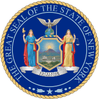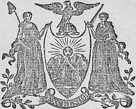 The coat of arms of the late 19th century was already presented in color. There are considerable changes here. In the lower corners, there are no branches with leaves, the eagle’s head is turned to the other side and the top of the shield is not so rounded. The coat of arms also began to use a yellow background. In 1896, this depiction was officially adopted as the coat of arms of New York.