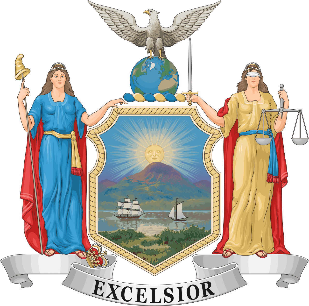On both sides of the shield, the coat of arms depicts two supports in the form of women: Liberty and Justice. One holds a pole with a Phrygian hat on the tip, and the British crown lies under her feet. This depiction is a symbol of independence from the British monarchy, which colonized the lands of New York in the 17th century. The other woman is the personification of justice. She holds scales and the legendary sword of justice.